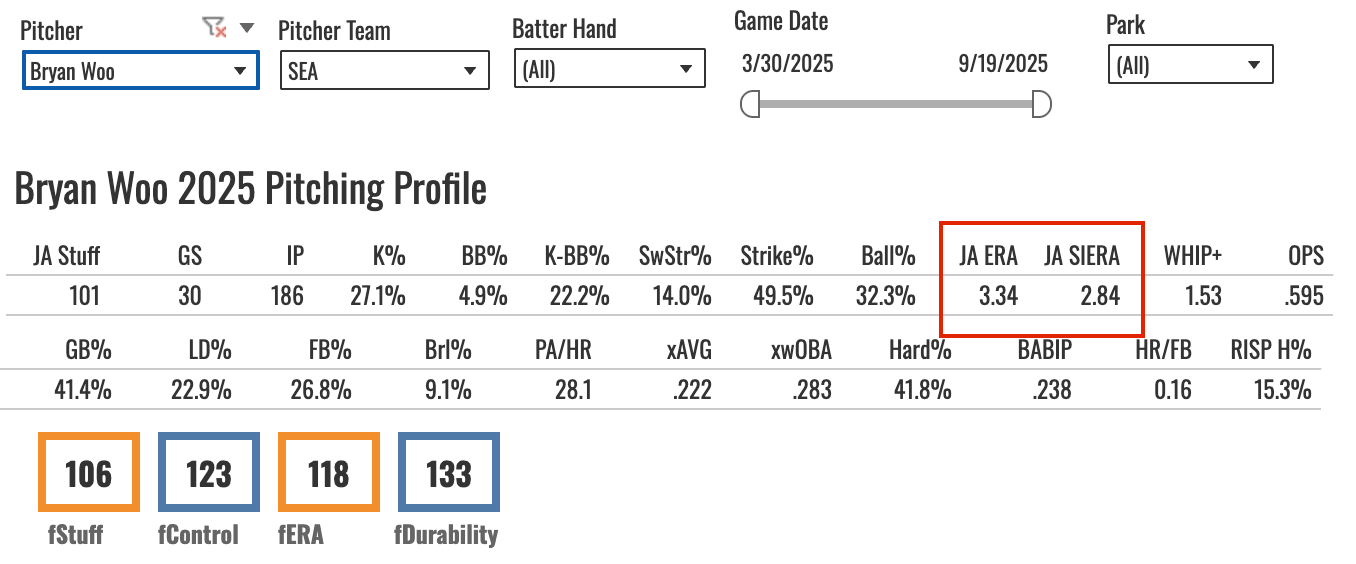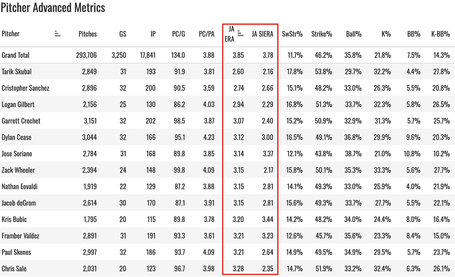 In May of this year (2025), I introduced JA ERA. This was really not a huge development. As I explained in that linked post, it was just my own copy of SIERA. Same inputs with slightly different weights and intercept, so JA ERA and SIERA did not exactly match, but the order would be almost exactly the same (meaning you’d see essentially the same top 10 when looking at both stats).
