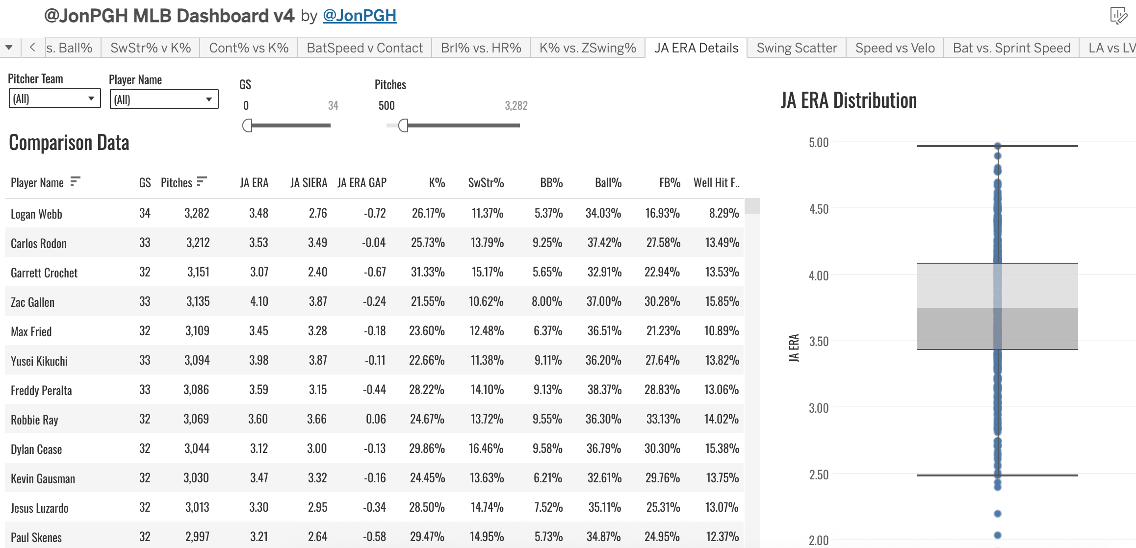 There’s also a new tab on the dashboard called JA ERA Details. This show you the comparison between JA ERA and JA SIERA, as well as the calculated difference, and all of the different inputs for both.