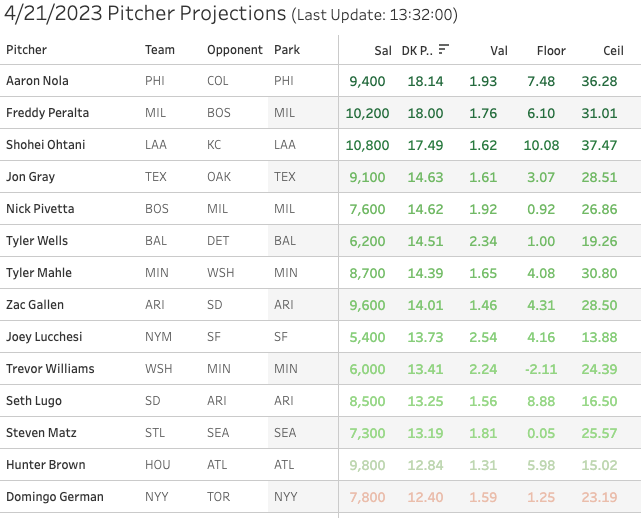 The cash instinct for me is to go to Ohtani + Peralta. The third option would probably be Nola even with the horrible start to the year he’s had. I’m just not going to worry about four starts with him, and the matchup is pristine there.