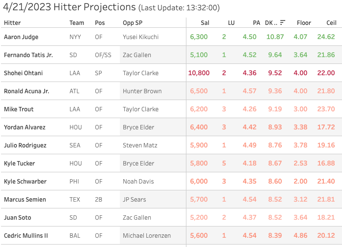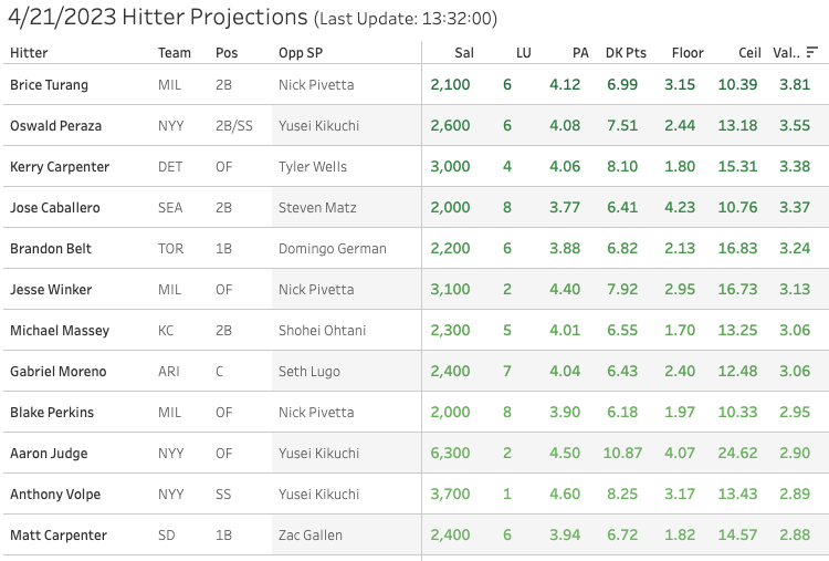 All of that is before lineups come out. We usually see some new names pop into the values and top plays once lineups start rolling out, so keep an eye on the projections which refresh every 20 minutes.