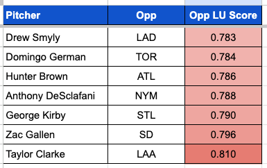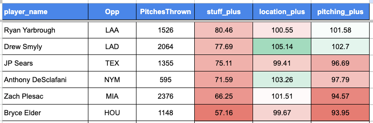 An Astros stack is also pretty interesting against Bryce Elder. He has been quite good this year but these are the Astros, and Elder doesn’t jump off the page with the stuff+ data, here are the worst stuff+ marks for tonight’s SPs: