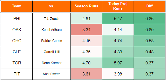 The Phillies aren’t on the slate, which leaves the Athletics at the top of the board here in terms of expected runs boost. That’s because they’re facing Kohei Arihara, who is… not good.