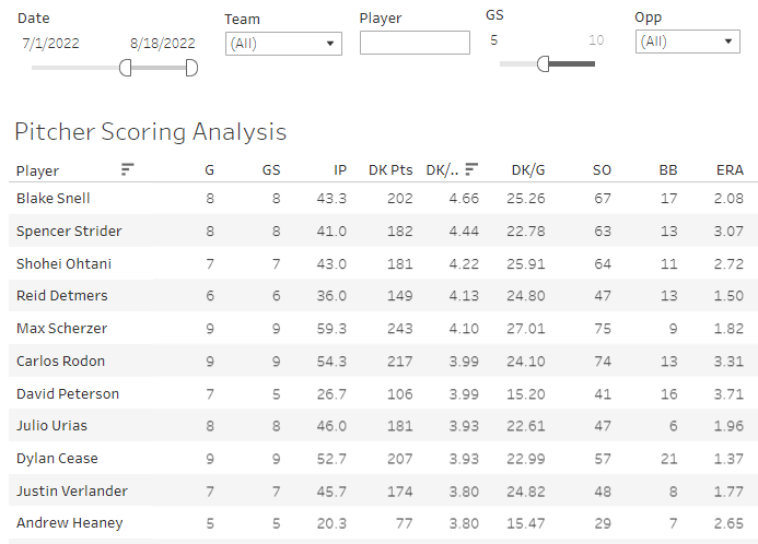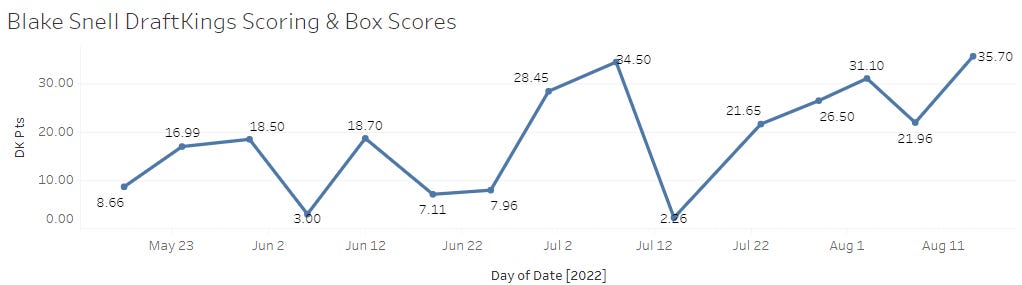 Snell is basically the opposite of McClanahan. Bad for most of the year, but in great form lately. In fact, nobody has scored more points per inning than Snell since July 1st.