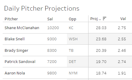 He’s handled the Mets just fine three times this year, going over 20 points each time. I can’t shake the feeling that going back to the well a fourth time will be bad. The projection is pretty low as well at 18.7, which is a no-go with the $9800 price tag. I’ll fade Nola, I guess, but man it feels weird to prefer Singer to Nola.
