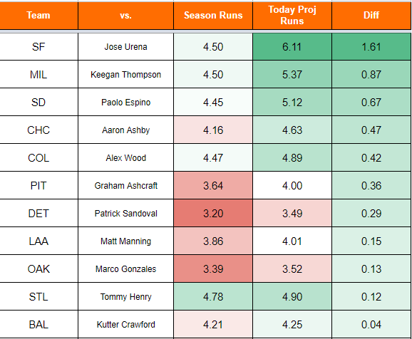 Adding to that, the Giants are a frustrating team to play because they pinch-hit so much. All of the top projections on offense tonight are Giants