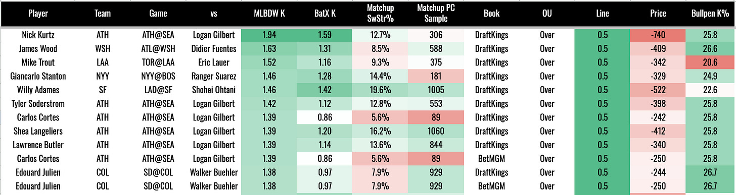 The most successful prop type so far in the projections has been the hitter strikeouts. We’ve had plenty of success in this market in the past, so much so that the books removed the lines altogether a couple of seasons ago.