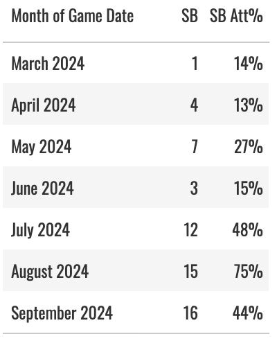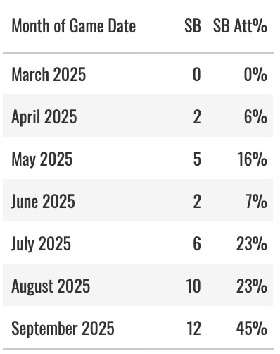 The first example of this was Shohei Ohtani in 2024. All eyes were on his chase for the first-ever 50-50 season, and no doubt that was in his head as well. He went for around 17% attempt rate from March-June, and then once he got a whiff of history, he started going nuts. He stole 31 bases in the final two months of the season with an attempt rate well north of 50%.