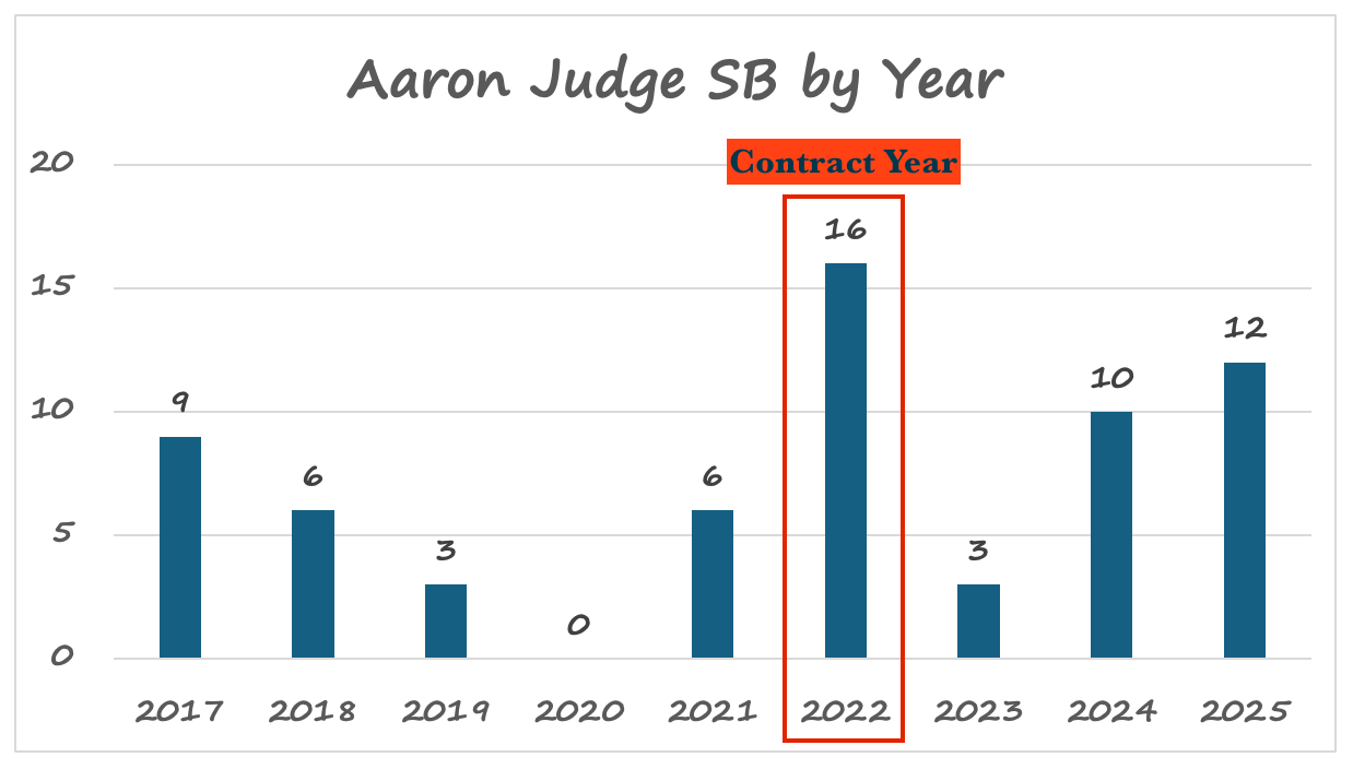 We saw this with Aaron Judge when he stole 16 bases in his contract year in 2022, adding five steals to his previous career high and ten from the prior year.