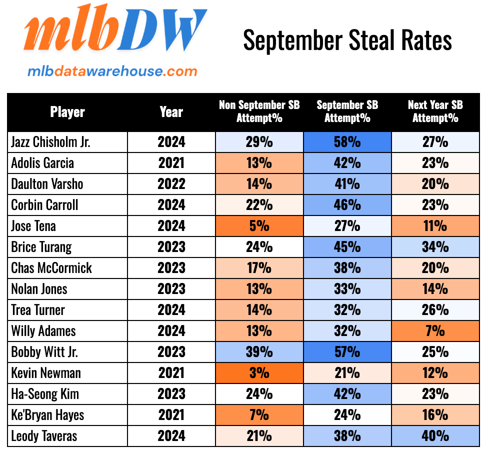Stolen bases increase in September. I examine why this is and find some potential steals decliners in 2026.