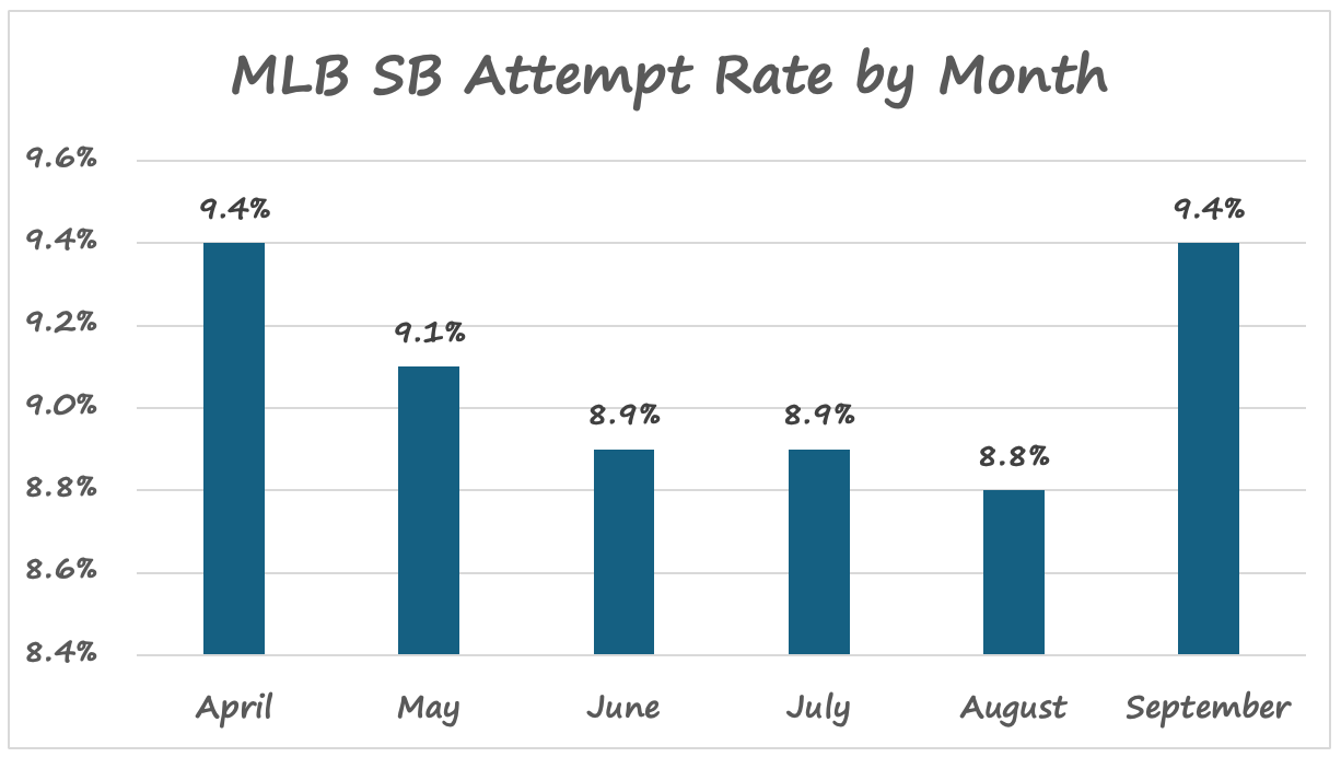 It seems to me that, in certain situations, we should throw out late-season steals. The first thing I did to test this was look at league-wide stolen base attempt rates by month dating back to 2021. If my theory is true, then the portion of the players in the league trying to reach a certain SB milestone late in the year should result in a higher-than-average league attempt rate in September.