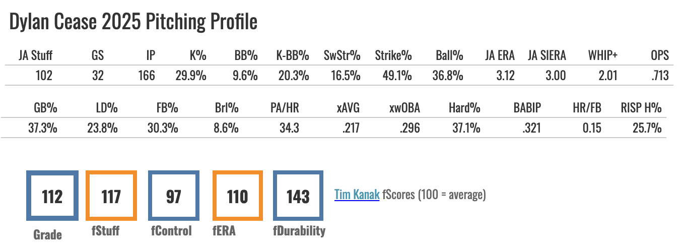 Cease was clearly a buy-low option. He’s one of the best strikeout pitchers in the game, and he’s delivered 32+ starts in each of the last five seasons. That’s an incredibly valuable asset.