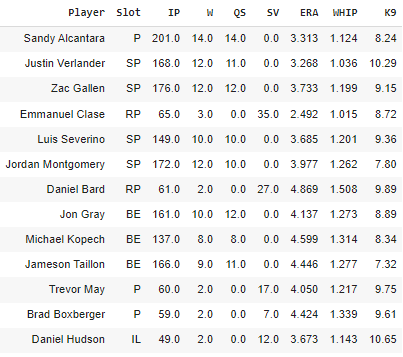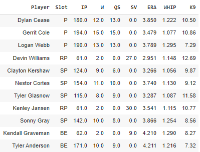 After the first pick of the draft was made, Colin had three of the game’s best hitters on his team with Acuna, Judge, and Betts. He seemed to have thought that was good enough on offense because the rest of his hitter picks just didn’t do it for me or for the projections.