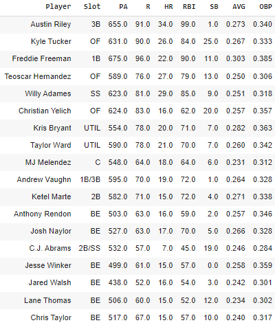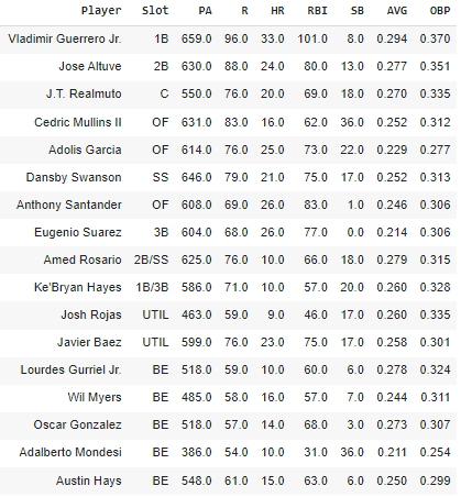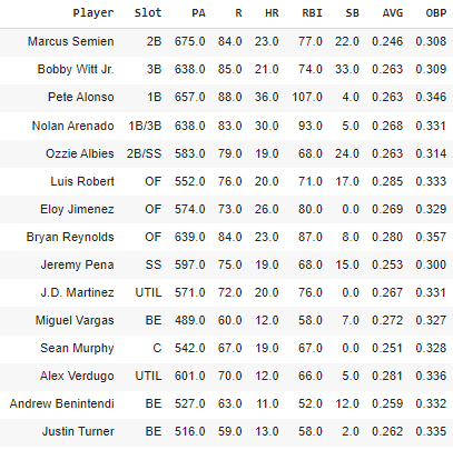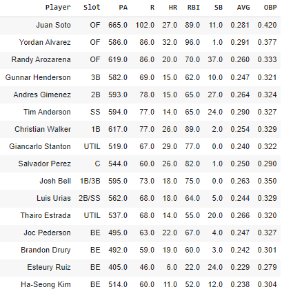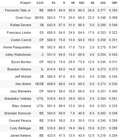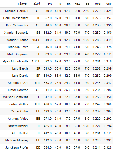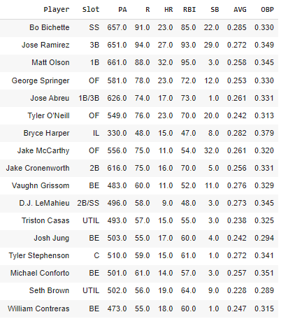 The rest of the offense has power and upside pretty much all through it. The one thing he doesn’t have is steals - but if any of those rookies break out they presumedly would steal a bunch of bases on their way to it.