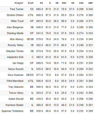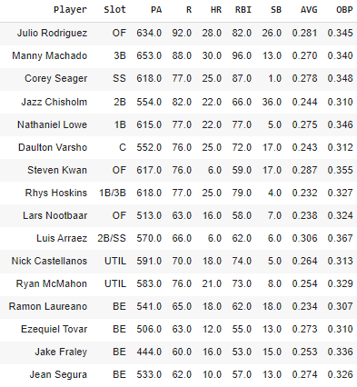 The problem is most of these studs are currently hurt. If he loses any significant amount of time from Soto/Yordan, there is big time trouble brewing, and I’m knocking him down a half point just because of that.