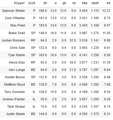 If Jake McCarthy loses the starting job (entirely possible), Clint might be in some trouble with steals, but we’re talking about “ifs” now. The offense is like a 4.5 or 5 right now, but Harper is worth at least a half of a point when gets back, so no real qualms on Clint’s hitter draft from me.