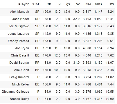 The staff is far from irredeemable, I just think it would have been wise to draft one more SP in the top 120 or so. At one point Mitch’s draft went Yelich-[Tucker]-Bryant-[Riley]-Ward-Polanco, 70+ picks without an SP right when a lot of really good SPs were available. I may have taken Blake Snell instead of Kris Bryant, or something like that.