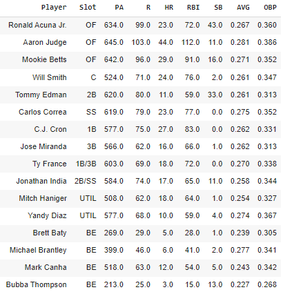 The only hitters on the squad that can reasonably hit 30+ homers are Judge, Acuna, and Cron - and Cron is banged up right now. He also just has two really good steals sources (Edman & Acuna), and he has a ton of guys projected in single-digits, which isn’t great.