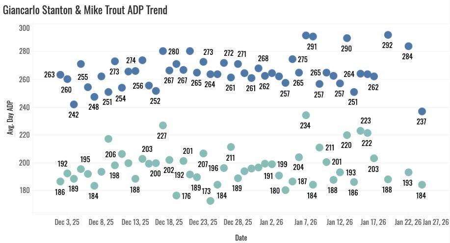 I didn’t think we’d be calling Trout a bust when the price is around ADP 200. But it seems to me like he’s still priced as if he’s a great hitter who just needs to stay healthy. The truth is that, in these last three seasons, he’s hit .242 with a 30% K% while stealing just ten bases (241 games). Six of those steals came ina short dash in 2024 when he was running again. The attempt rate last year was 1%. So what are you drafting Trout for, other than homers?
