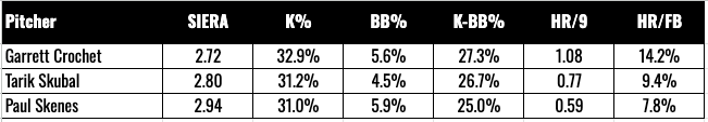 Skenes had the worst SIERA and the lowest K-BB% of the trio. He’s also posted HR/9 marks in his career that don’t seem repeatable. Pretty much nothing about his first two years seem like something that a pitcher could keep up for very long. But maybe he’s just truly that good. He does have pitch mix depth and velocity that few others have ever had. And it’s a good park for limiting homers.