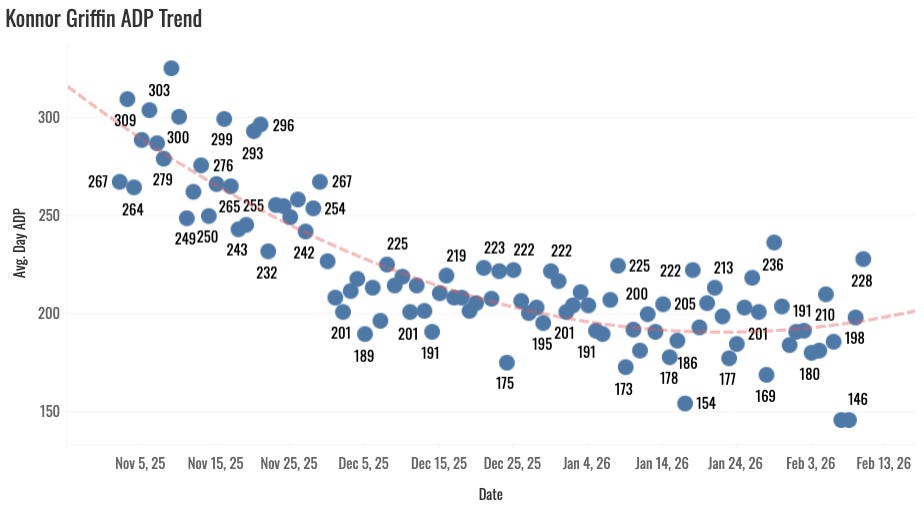 The 50 HR+SB were great, but his .722 OPS was pretty mediocre, and when you look at the full picture, you see that he was not at all the player he’s come to be since then. These adjustments take time, so I don’t think the top 250 price on Griffin is justified for 2026.