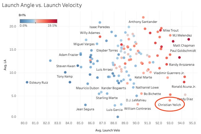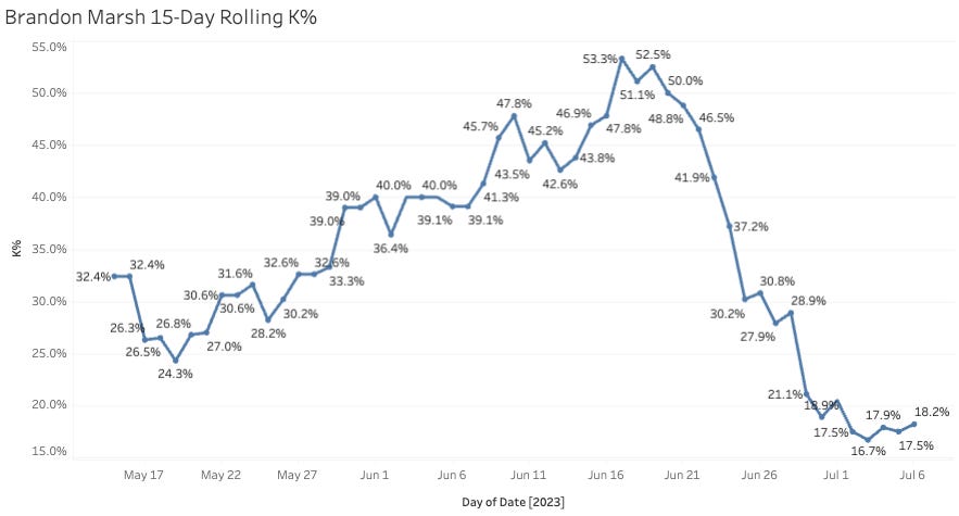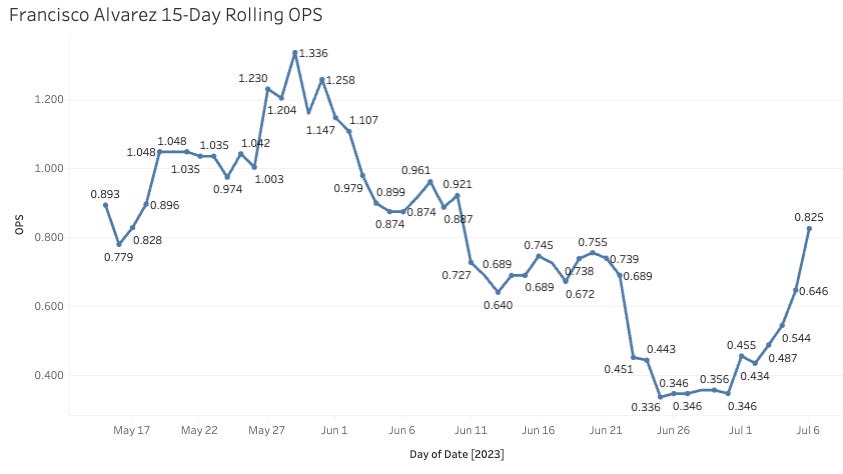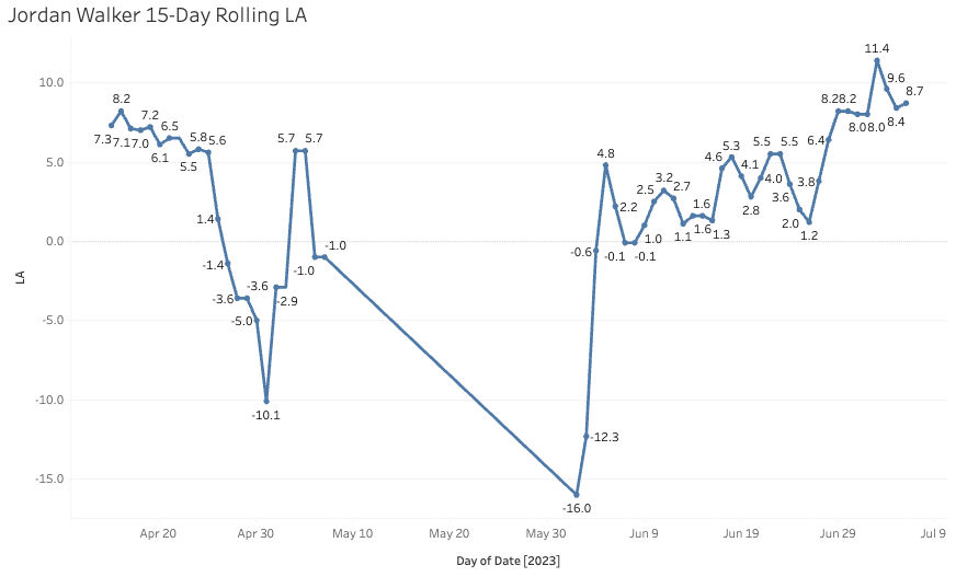 I just love this guy. You’re going to have some major ups and downs, obviously, but I think that could eventually even out because he’s clearly making better swing decision this year with a 16% BB% and a low 16% Chase%. Even with the high K%, he’s in fantastic company with the Brl/PA and HR/PA. And he’s also stealing some bags - Jack could really explode here in the second half and set himself up to be a top-25 OF pick next year.