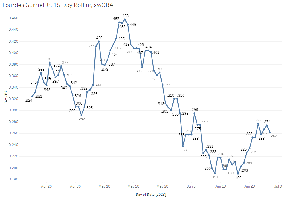 He’s one of my biggest buy-lows overall right now. He has a strong 50% hard-hit rate with a fine 25% K% and an 8.9% Brl%. He just hasn’t hit many fly balls, but he’s not far away from that - it’s not like he’s pounding the ball into the ground with a GB% of 45%. I really like his ability to make contact at a high rate while hitting the ball quite hard, and I think he’s a standard league starter for the second half - and he’s probably on waivers in a ton of leagues.