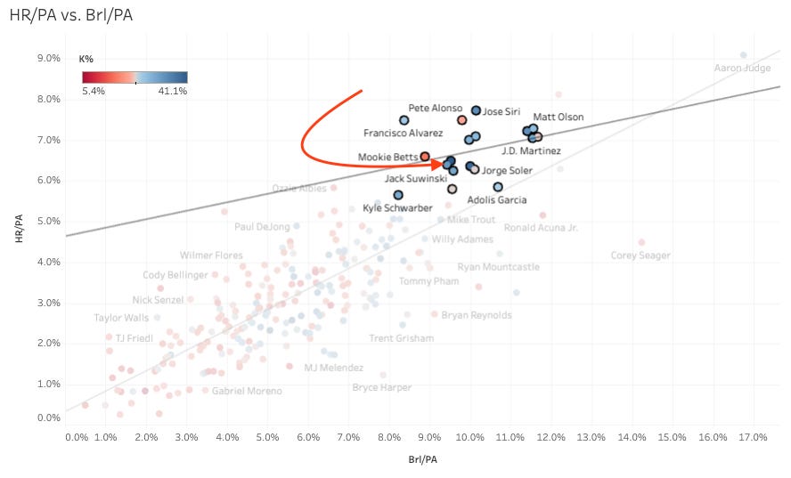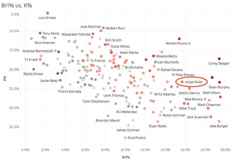 You know how many players have a Brl% above 15% and a K% below 25% this year? Four! And yes, Soler is one of them. The other three are Acuna, Ohtani, and Adolis Garcia - good company there. We have seen this from Soler before, and he hasn’t ever been able to keep it up for long periods of time, but right now he’s one of the best power hitters in the league and you can almost surely get him pretty cheap given his history.