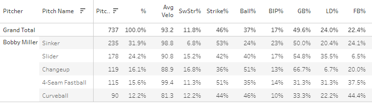 It hasn’t gone super well for Miller lately, but I’m buying in for the rest of the year. He has a lot of innings left in the tank (he threw 112 last year and is at just 58 this year), and the stuff is so just so good. He has so many different pitches and they’re all strong - I think this is a guy who can turn into an ace pretty quickly if he makes some steps forward. He has five pitches above a 10% usage, and four of them have double-digit SwStr%, and he hasn’t had big issues with throwing strikes or anything - so it’s a solid base profile and the upside is huge.