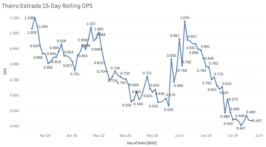 He had an unreal start to the year, and then a little downturn, and then a really good couple of weeks before really hitting the bottom here recently.I want to look at the season as a whole. Estrada was drafted for steals, but you’ve gotten more than that from him this year. But the power doesn’t seem to really be there with just a 5.6% Brl% and a 34% Hard-Hit%. I think the nine homers is likely inflated, and he also may have benefited a good bit from this high .340 BABIP.