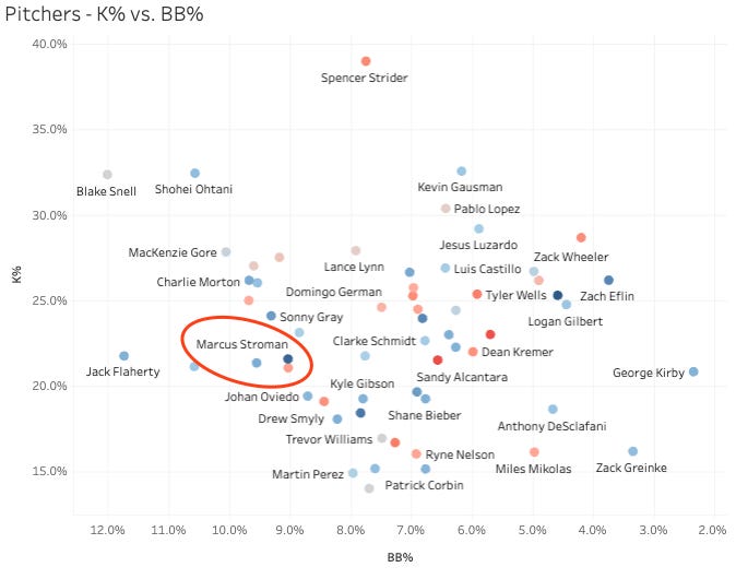 2.97 ERA but a 4.13 xFIP. The K-BB% is just 10.6%, similar to names like Josiah Gray, Drew Smyly, Johan Oviedo. That’s not exactly fair because Elder does have this 56% GB% driven by his very good sinker, but he’s simply not a 3.00 ERA guy and I have a feeling you’ll see that bloat soon.