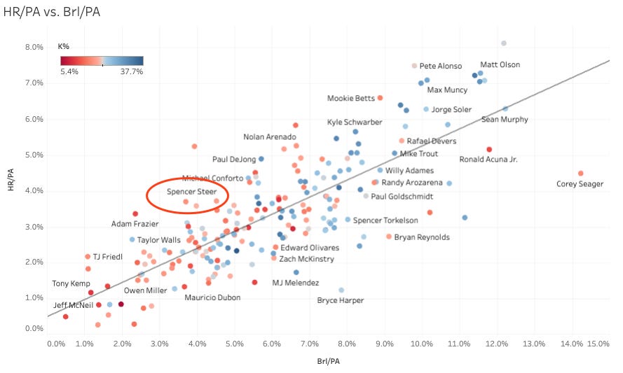 I think Steer is good, and I want to stress that I’m talking about keeper or dynasty leagues here at all. I just see the home run production being a little bit inflated right now. His 4.5% Brl/PA is well behind his 3.7% HR/PA (shown below), and he still will have to play half of his games away from Cincinnati. At this very moment, he might be one of these guys who is better in real life than in fantasy due to the middling power and speed combo.