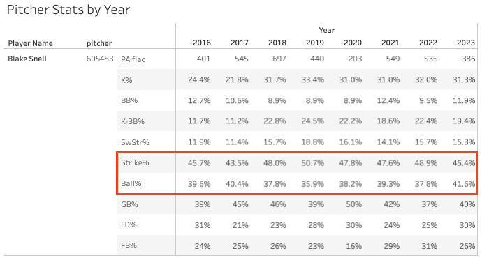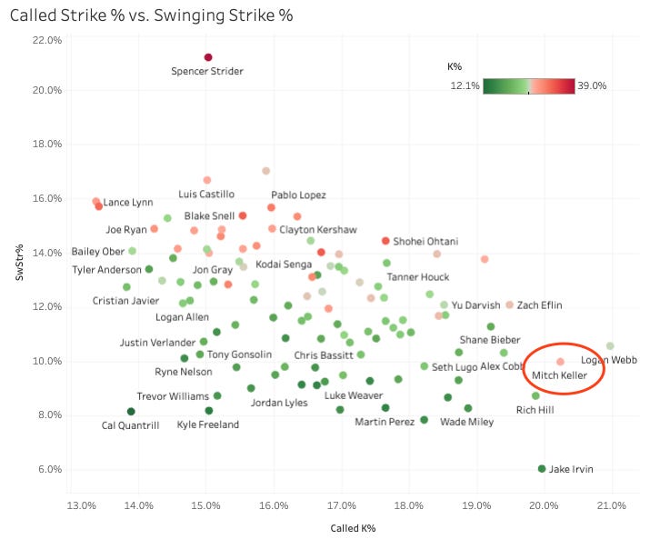 His K% has been declining, but it’s still inflated. He has benefited from called strikes more than anyone else. This stat isn’t competely random, it’s definitely a skill some pitchers can have if they have fantastic command and a bunch of different pitches, and Keller has both of those things going - but I don’t think he’s the guy we saw in the first half.
