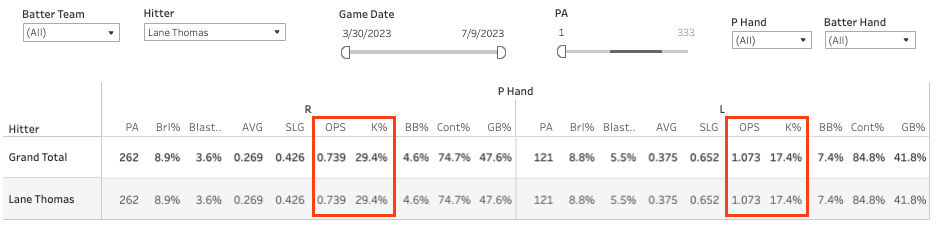 I will pass on any young guy with a 34% K%, which Jones has. He’ll have some big games - but I think it will be much more negative than positive given the whiff-heavy ways (69% Contact%). He’s also not running as much as we thought he would at an 11% SB Att%, that’s about the same attempt rate as Andrew McCutchen and Freddie Freeman - not guys you really depend on for steals in the 2023 context.