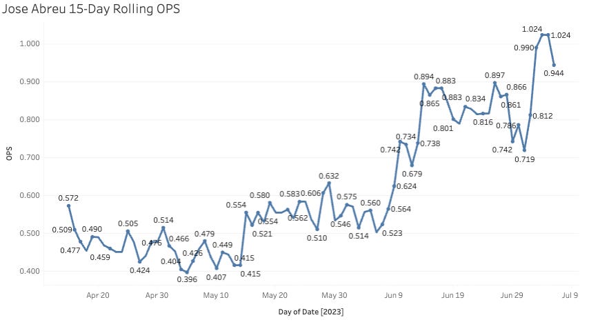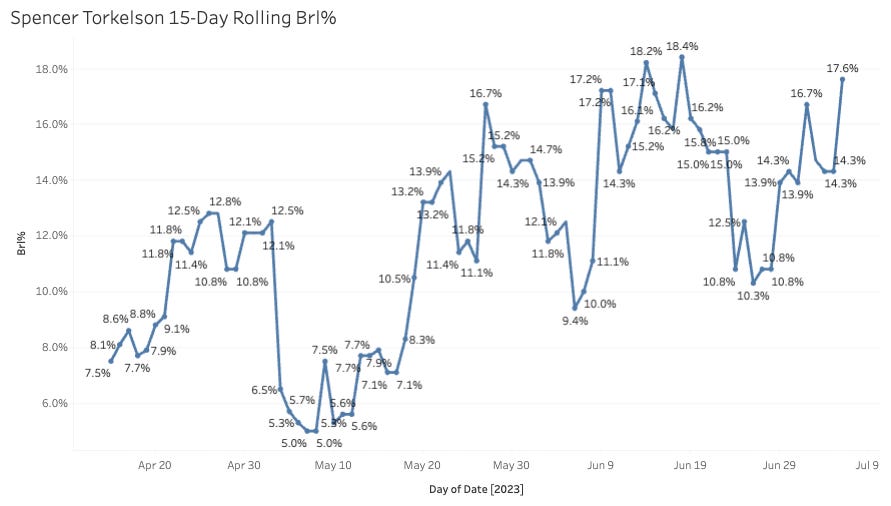 There is a trio of Tigers hitters I want in on, but Torkelson is the dog guy. He has been limiting strikeouts and hitting the ball hard all year long, but now he’s starting to elevate it. That has turned into a 16% Brl% since June 1st. Time to buy! (I also really like what we’ve seen from Riley Greene and Kerry Carpenter on the hitting side and Tarik Skubal on the pithing side).
