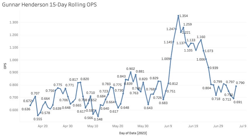 It’s been bad, and then elite, and then good for Gunnar so far. I’m not sure who he’ll be in the second half, but I’d rather be on the buy side of a guy with this kind of raw power and speed. He has an 11.9% Brl% and a 30% K% that’s been trending in the right direction, so maybe he’s figuring some stuff out and will meet some bit of his potential sooner rather than later.