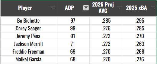 The best offense is a good defense, as they say. You can get a good fantasy team batting average by drafting a bunch of dudes who will hit .280. That’s true. Or, you can just avoid all the dudes that will hit below .240. You don’t need to use a pick on a Jacob Wilson or a Steven Kwan, or a Luis Arraez if the rest of your squad is full of .260-.270 hitters.