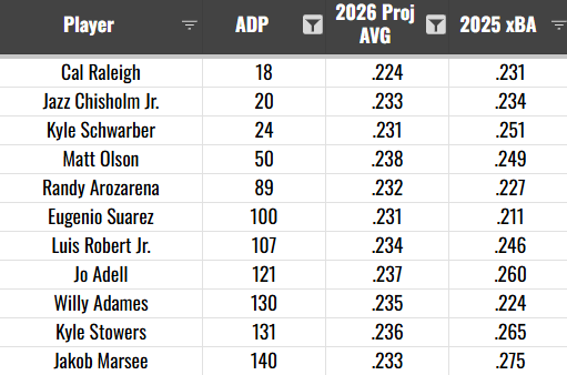 Those are hitters in the top 150 of ADP with a projected average below .240. The Bat X is pretty harsh on the young Jakob Marsee, but that’s why I like projections. We get to crap on the rookies. There’s not enough good old fashion newbie hazing these days.