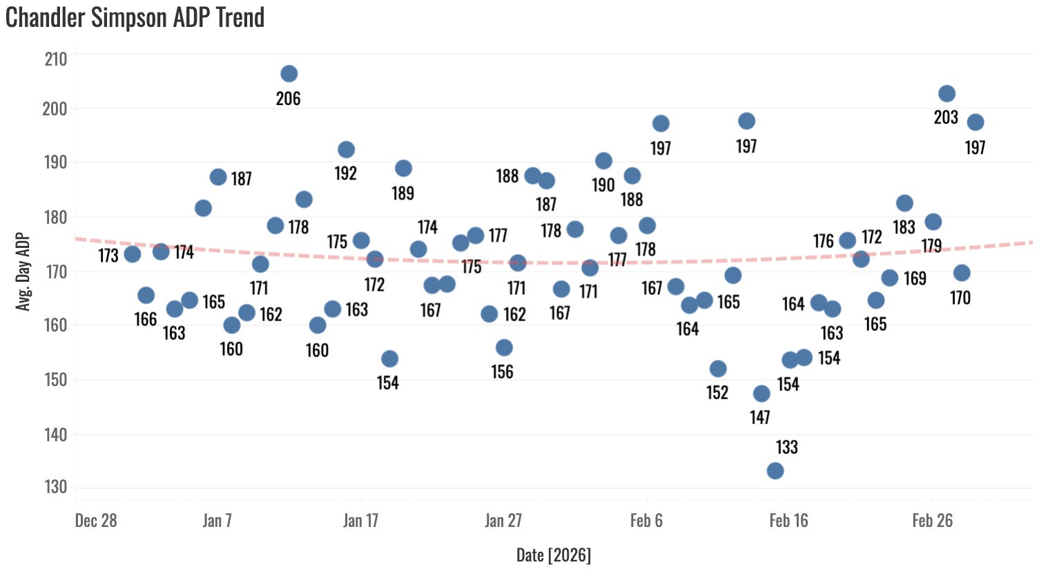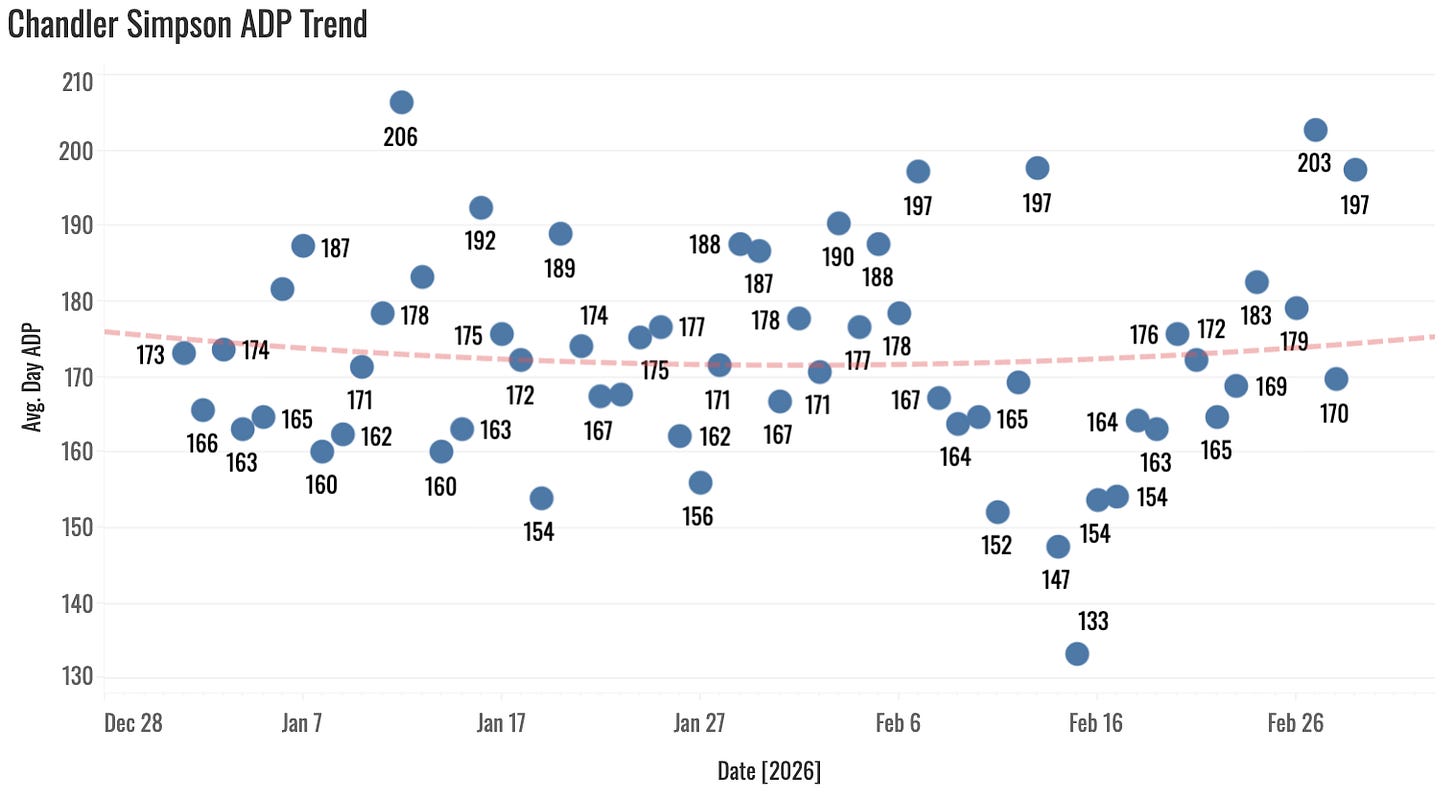 The price is shown there. He’s probably a 13th-ish round pick. So he’s by no means free. And I wish he were a better defender. So far, his defense hasn’t been something to keep him in the lineup like we find with other speedy centerfielders. That’s really my only hesitation with him. Maybe the defense will be so poor that the Rays opt to make him a part-time guy. It helps that Jake Mangum is gone. I think Simpson will play plenty. And there’s 80-steal upside if he does.