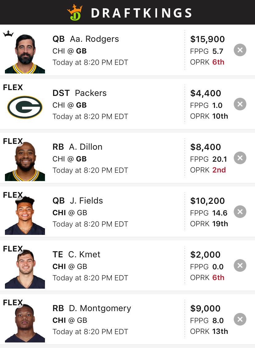CHI @ GB Showdown Optimal LineupJon ASep 18, 2022∙ Paid1ShareHere we go, going for five-for-five in double-ups! I’m only playing single entry stuff, and you can play head-to-heads with it too, just expect a lot of ties as these optimal lineups are always very popular. Good luck to us all!This post is for paid subscribersSubscribeAlready a paid subscriber? Sign in