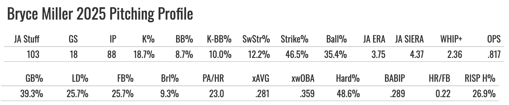 Not many interesting SPs for fantasy purposes on this list. Hancock, Hendricks, Parker, Mikolas, Vasquez, Freeland, Paddack, Quantrill, Mahle, and Irvin are off the list for 2026 already. But we can look at a guy like Bryce Miller: