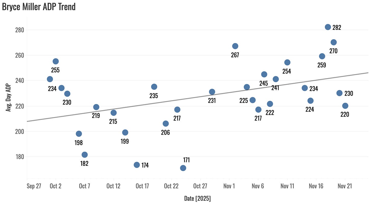Miller is very, very affordable in drafts this year. Some of that has to do with his bad performance in 2025, but most of it is about the health questions. We saw a “probably won’t need surgery” report on him after the Mariners were eliminated from the postseason. That’s what you call bad news disguised as good news.