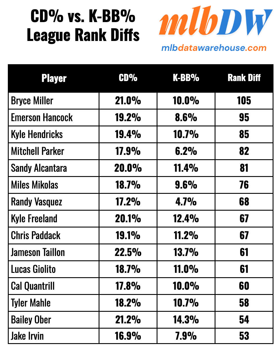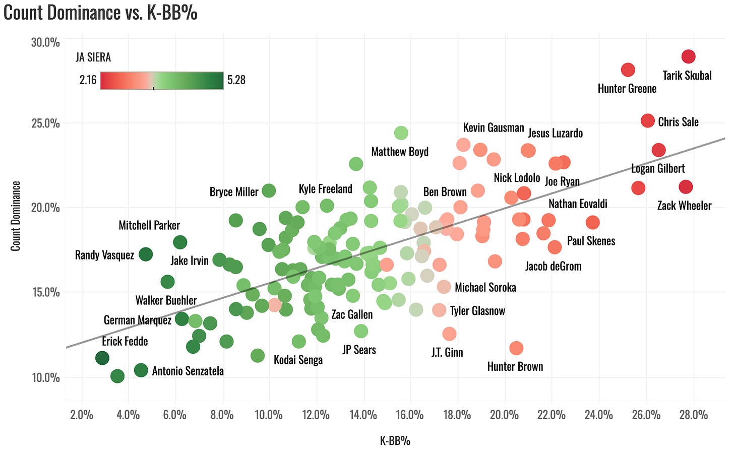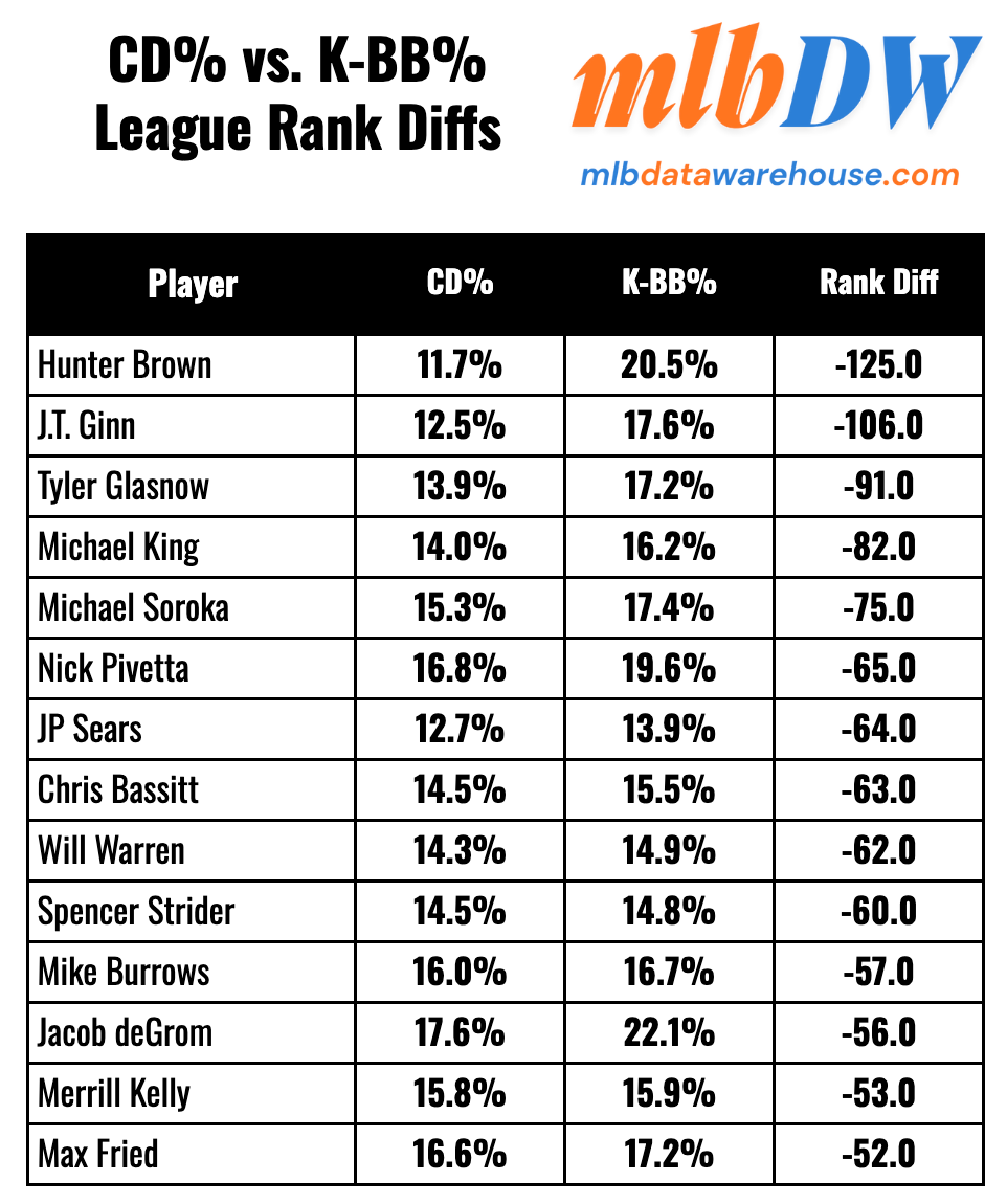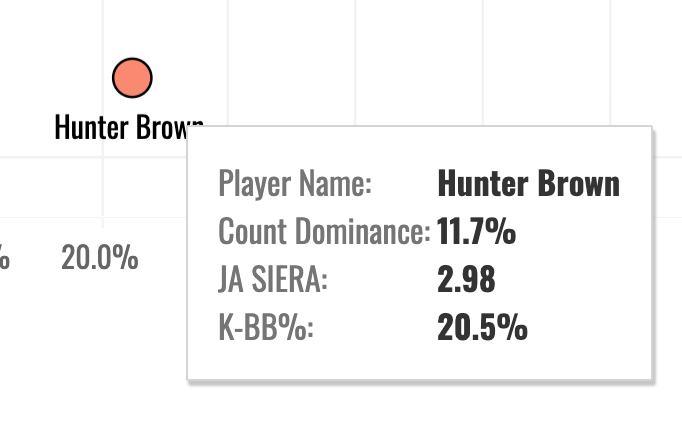 When looking at all SPs with at least 15 starts, Brown ranked #15 in K-BB%. But he ranked #144 in count dominance. I pulled those ranks for every SP (15 GS) and found rank gaps. Brown and JT Ginn towered above the rest of the league.