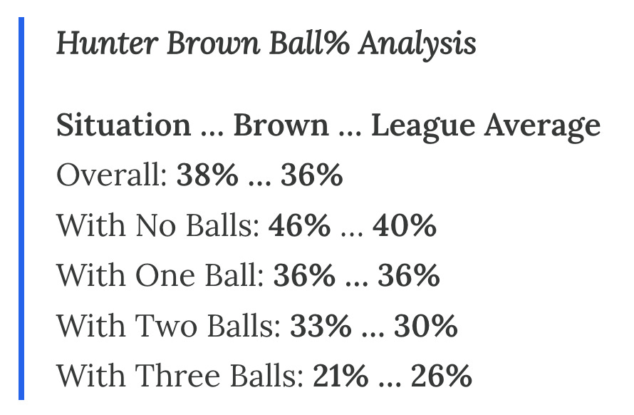 I would highly doubt that Brown is able to pull off another 21% Ball% in three-ball counts. If we look at 2024, Brown threw a ball 26% of the time in three-ball counts (the exact league average).