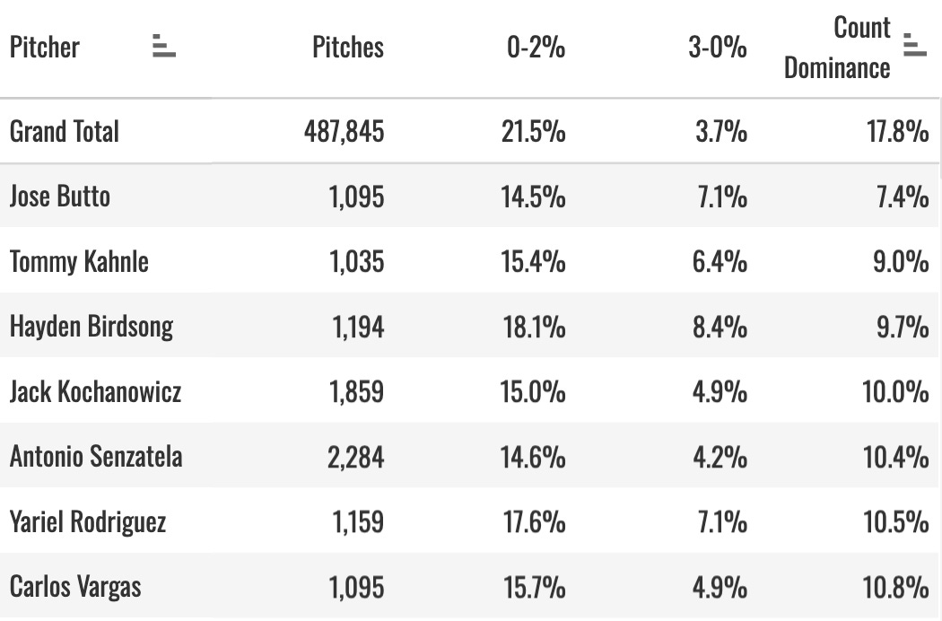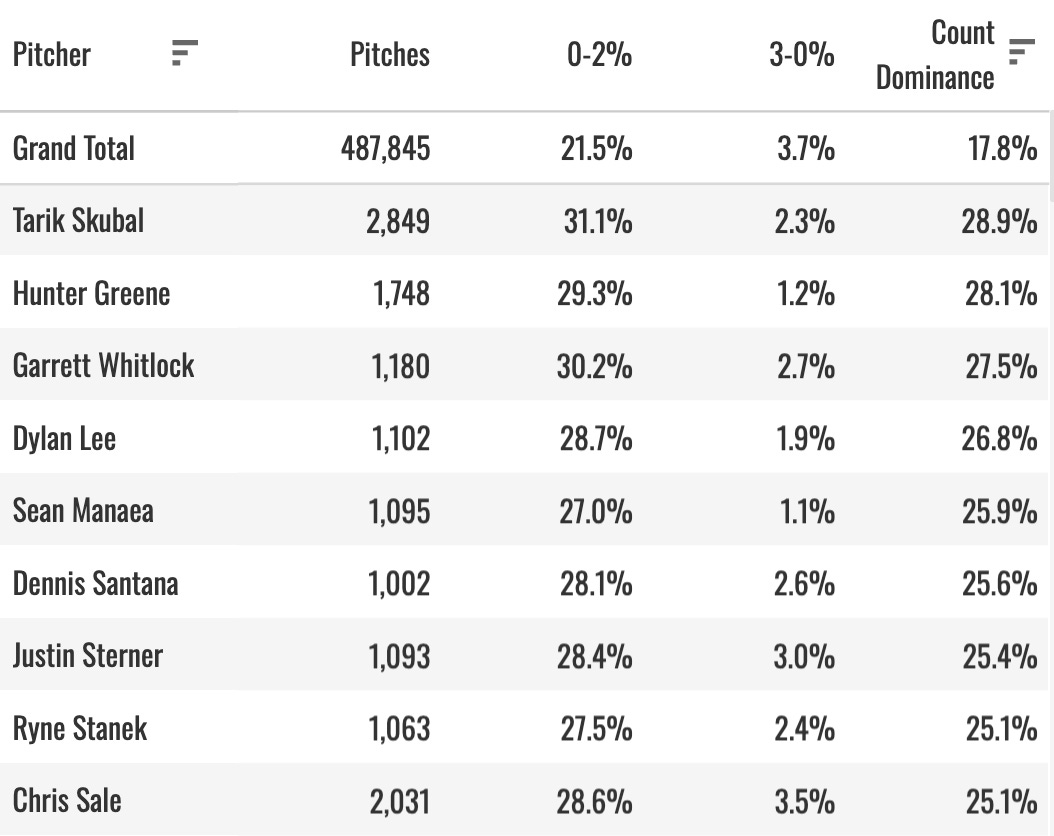 Tarik Skubal and Hunter Greene being on top is a positive sign. If you’re trying to measure pitcher dominance, you want to see Skubal on the top. He took an astounding 31% of counts to 0-2 and only went to 3-0 2.3% of the time.