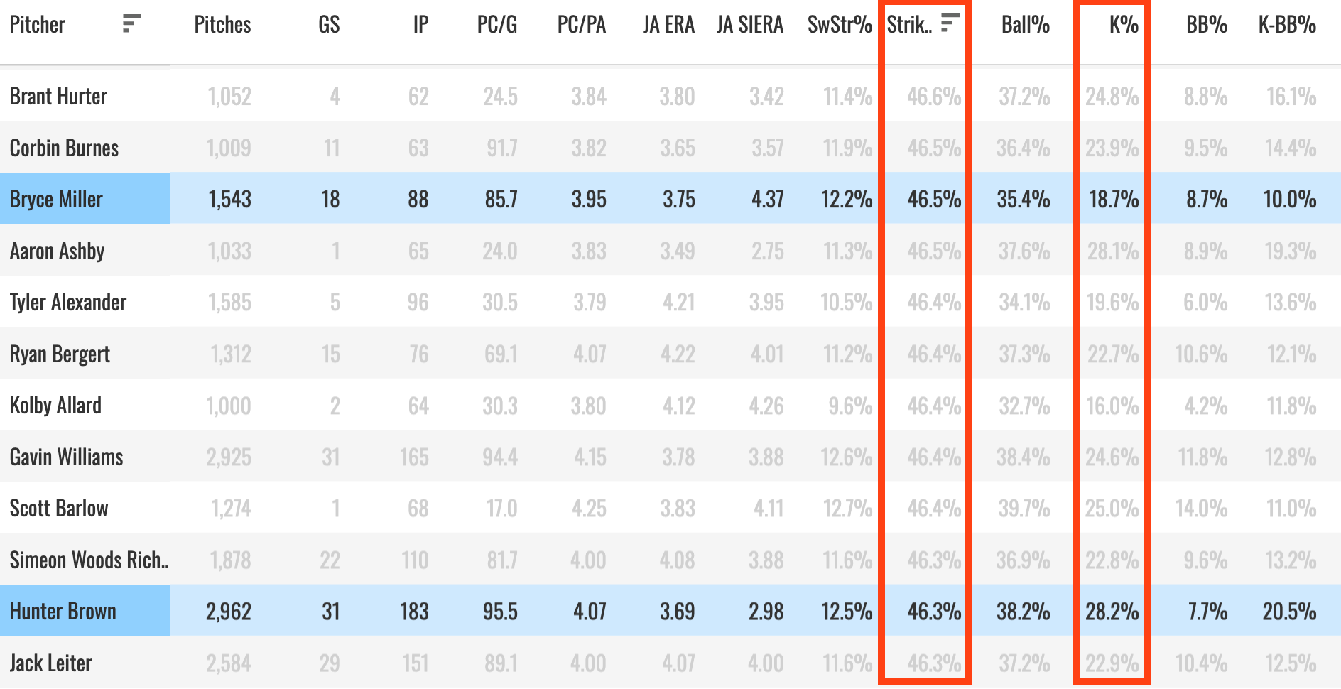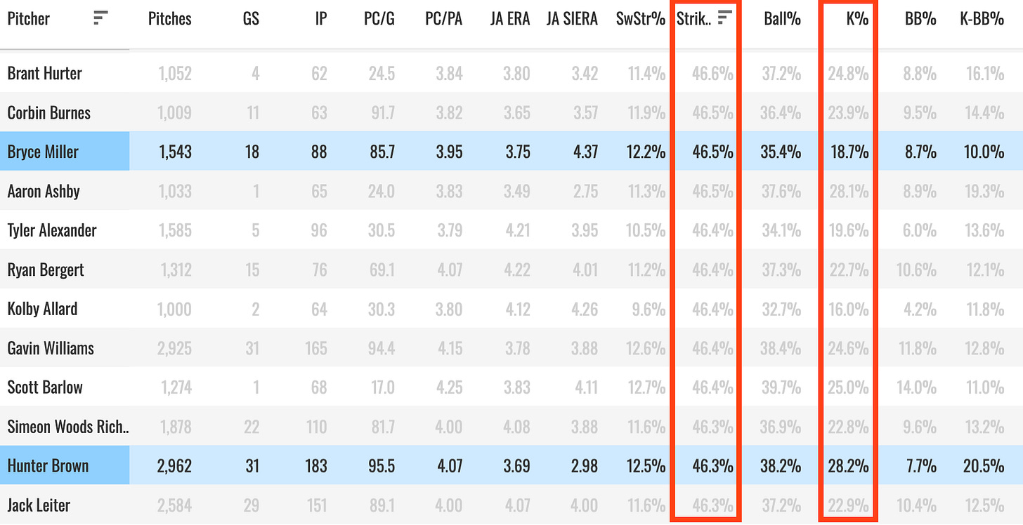 Same 46.5% Strike% as Hunter Brown! And yet almost ten points lower in K%. His Ball% was a point better than Brown, but his walk rate was a point worse!