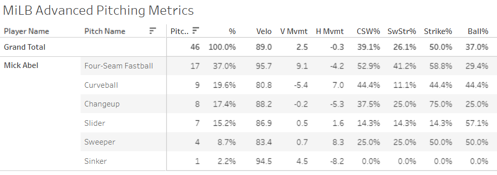 Abel went pretty hard in his spring debut. He racked up 12 whiffs with a sick 39% CSW%, a 26.1% Swstr%, and a 37% Ball%