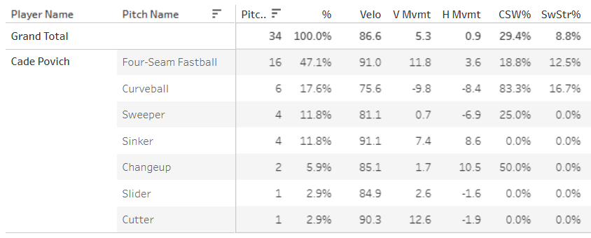A new sweeper from Cade Povich took his pitch mix depth to seven different pitches in his spring debut.