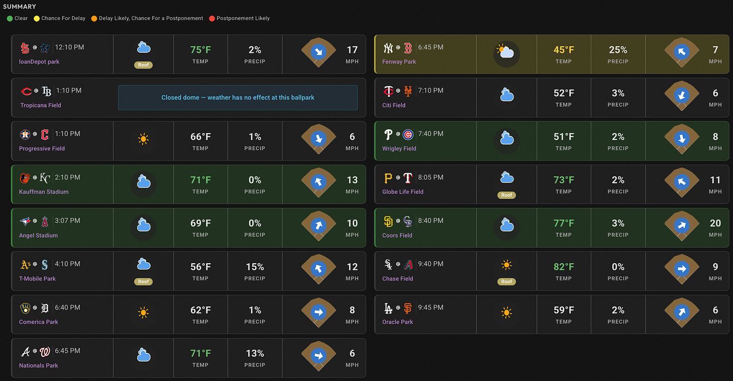 Jon here covering the night slate. I want to focus in on a small field lineup build tonight. Because I noticed something last night. We can get a pretty good idea of where cash ownership is going using The Bat X projections. Everybody ran to the Rockies/Padres game last night, as I also did, and that game went 1-0, so the slate was actually pretty easy to beat if you had just faded that Coors game. And sometimes that won’t be advisable, but we should have seen it last night. Chase Dollander and Randy Vasquez have been looked sharp this year, so it would’ve made a lot of sense to go away from game, at least a bit, in DFS last night.