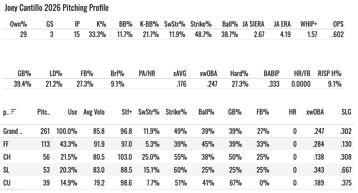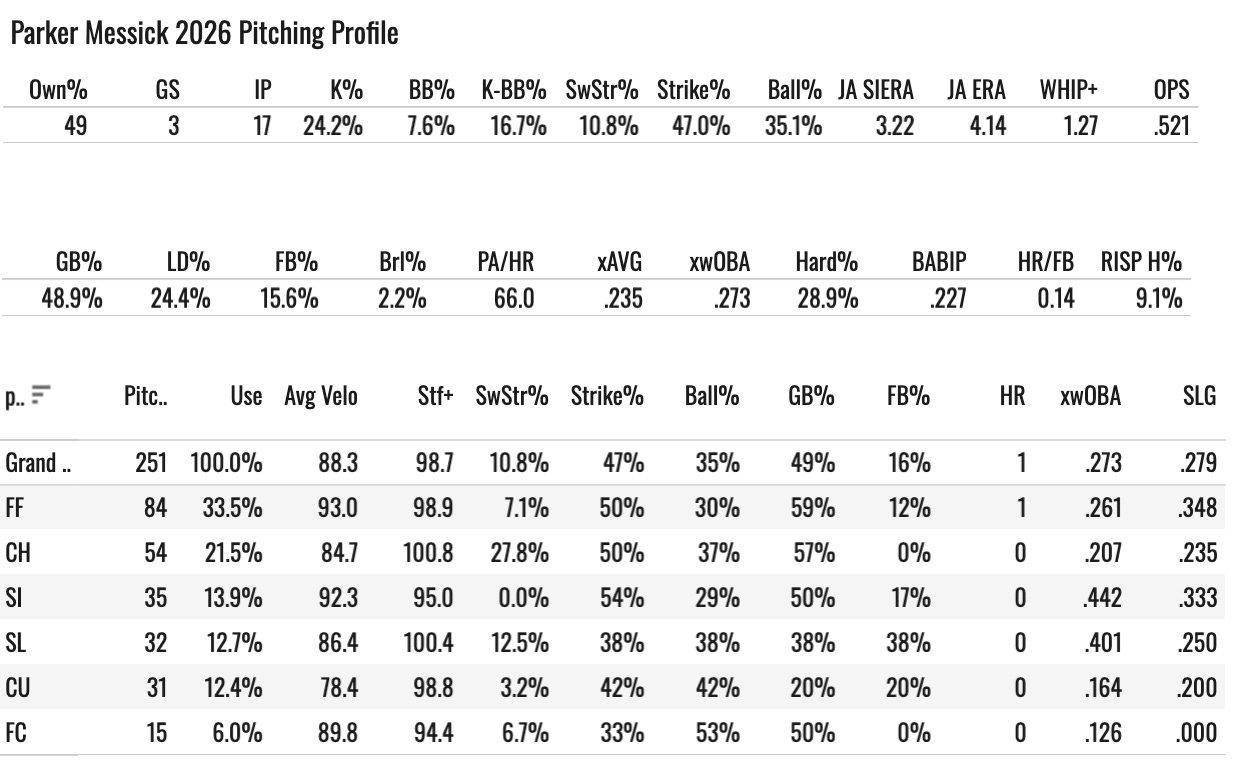 A sick 25% SwStr%, 55% Strike%, .138 xwOBA on that pitch. But the fastball is so, so bad. You can never feel confident in that dude. There will be ugly starts.