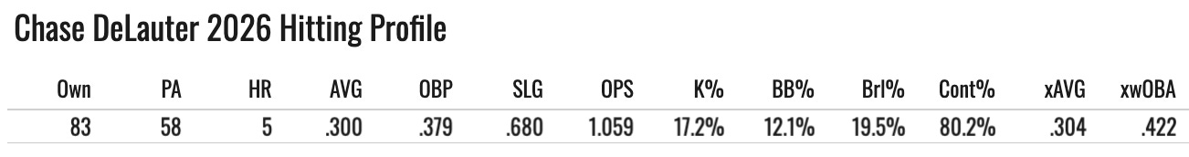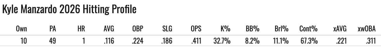 We have a 2B eligible player here, and he’s off to a ripping start. It’s probably largely fake. The bat speed and power stuff for his larger MLB sample aren’t good, and even in the minors he was around an average power hitter. But if you’re hurting at 2B (many such cases), you’ve got a potential add here.